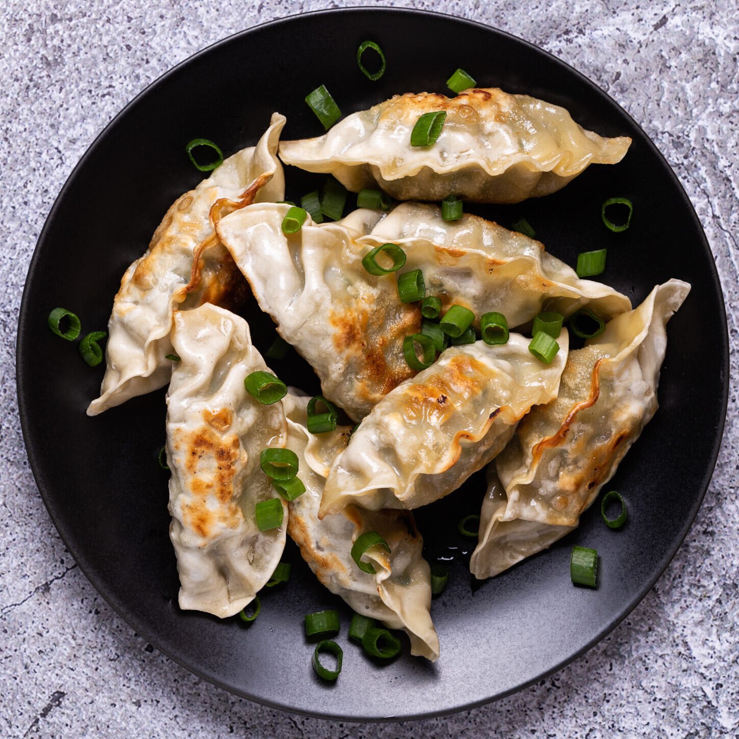 Crispy pan-fried dumplings served with savory dipping sauce.